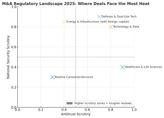 The 2025 regulatory environment is not broadly permissive, as some had hoped. Instead, it is sharper, more targeted, and increasingly shaped by geopolitical and economic considerations. Antitrust scrutiny continues in strategic sectors, while foreign capital faces heightened national security review.
